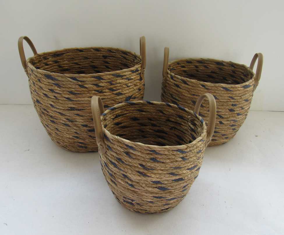 hand made rush plant basket with faux leather handle can add plastic pot or plastic liner